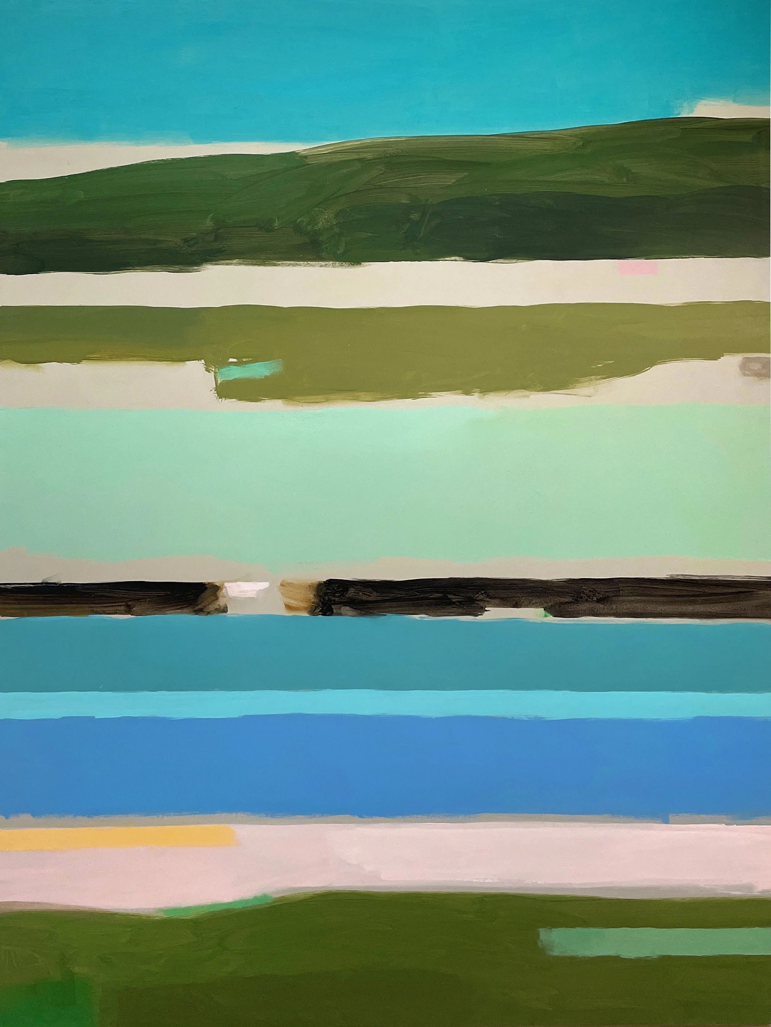 I'm fascinated by the middle-line state between pure abstraction and representation in landscape. In my most recent works I've employed a literal dividing line within my subjects that immediately push the subject from being real, to abstract – but the line also serves a purpose; it represents a simultaneous potential viewing of a landscape view at two differing times of day, or differing light conditions. Each half of the painting can be looked at separately, and imagined as the same landscape just interlinked; but looking at the whole, with sometimes unrealistic colour pairings, the painting takes on the notion of still recognisable, but also purely abstract piece of fiction and construction.